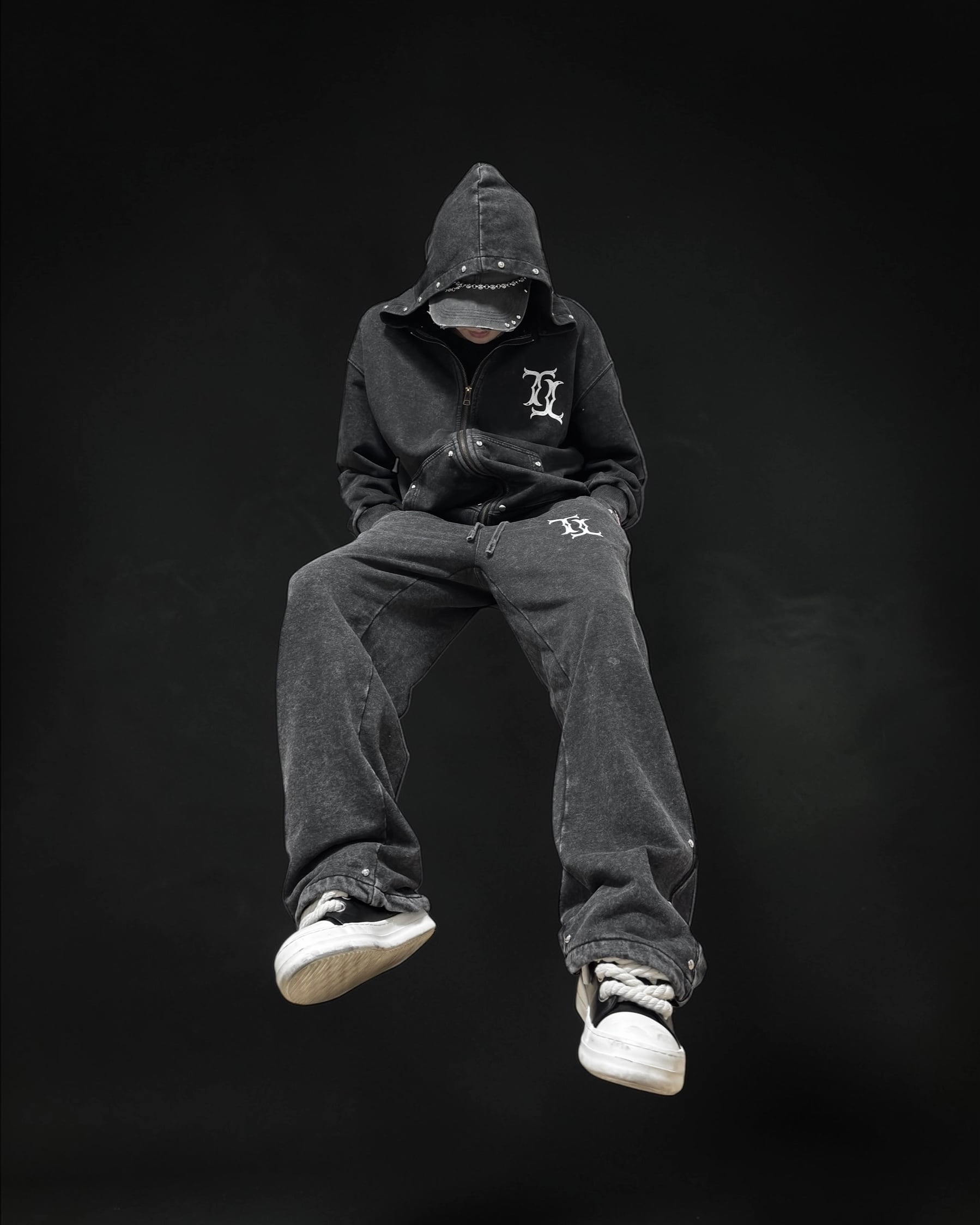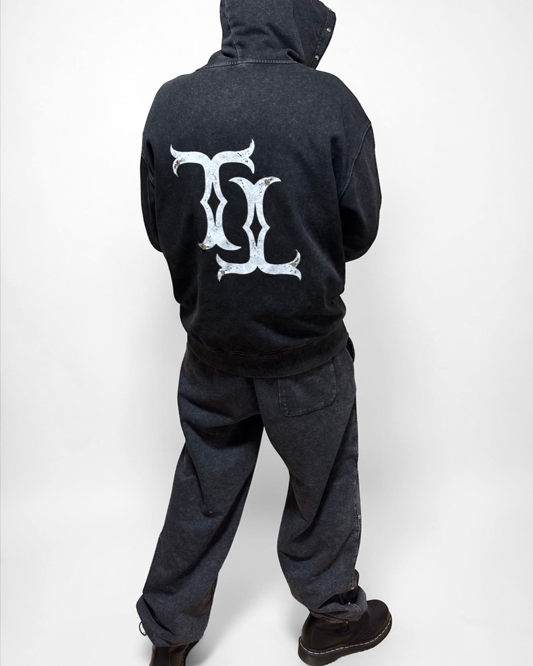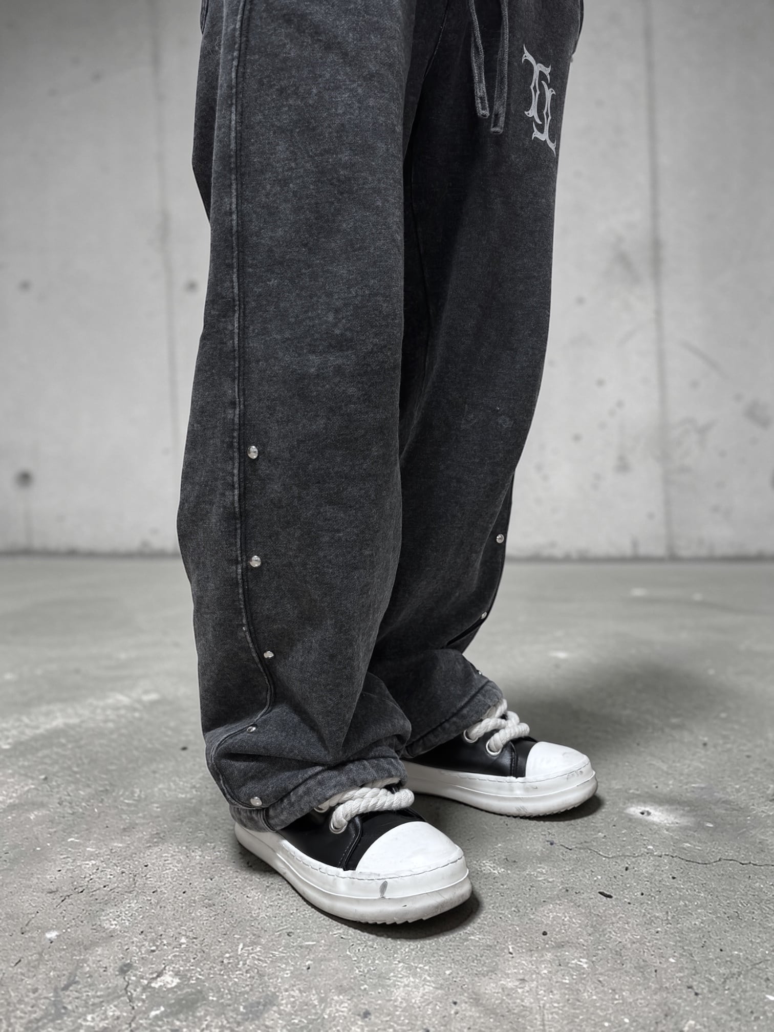 ポケット/裾元には1点1点ハンドメイドでスタッズが配置され、シンプルながらエッジの効いたアクセントに仕上げています。